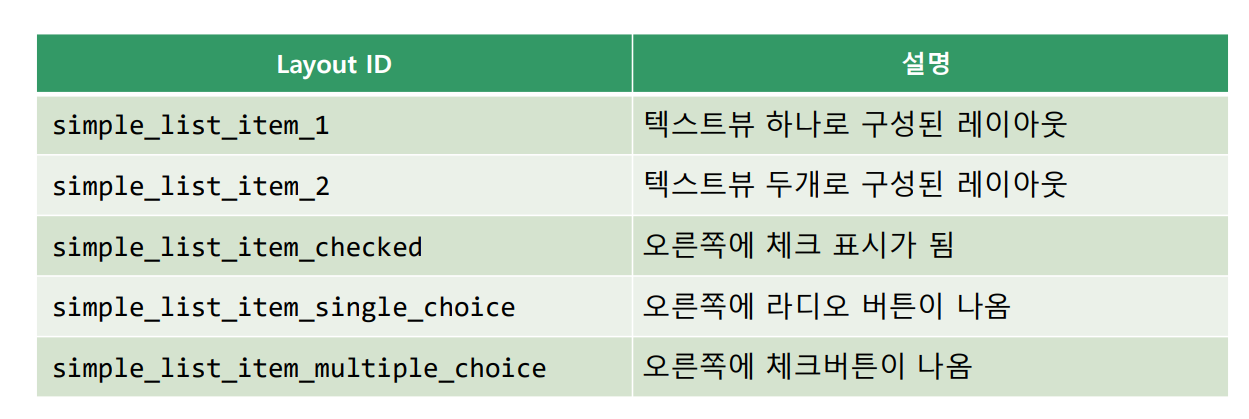 AdapterView : 같은 형태의 데이터가 반복되고 양이 많을 때(번호) ,화면 크기보다 더 큰 자료를 표현하는 방법의 하나